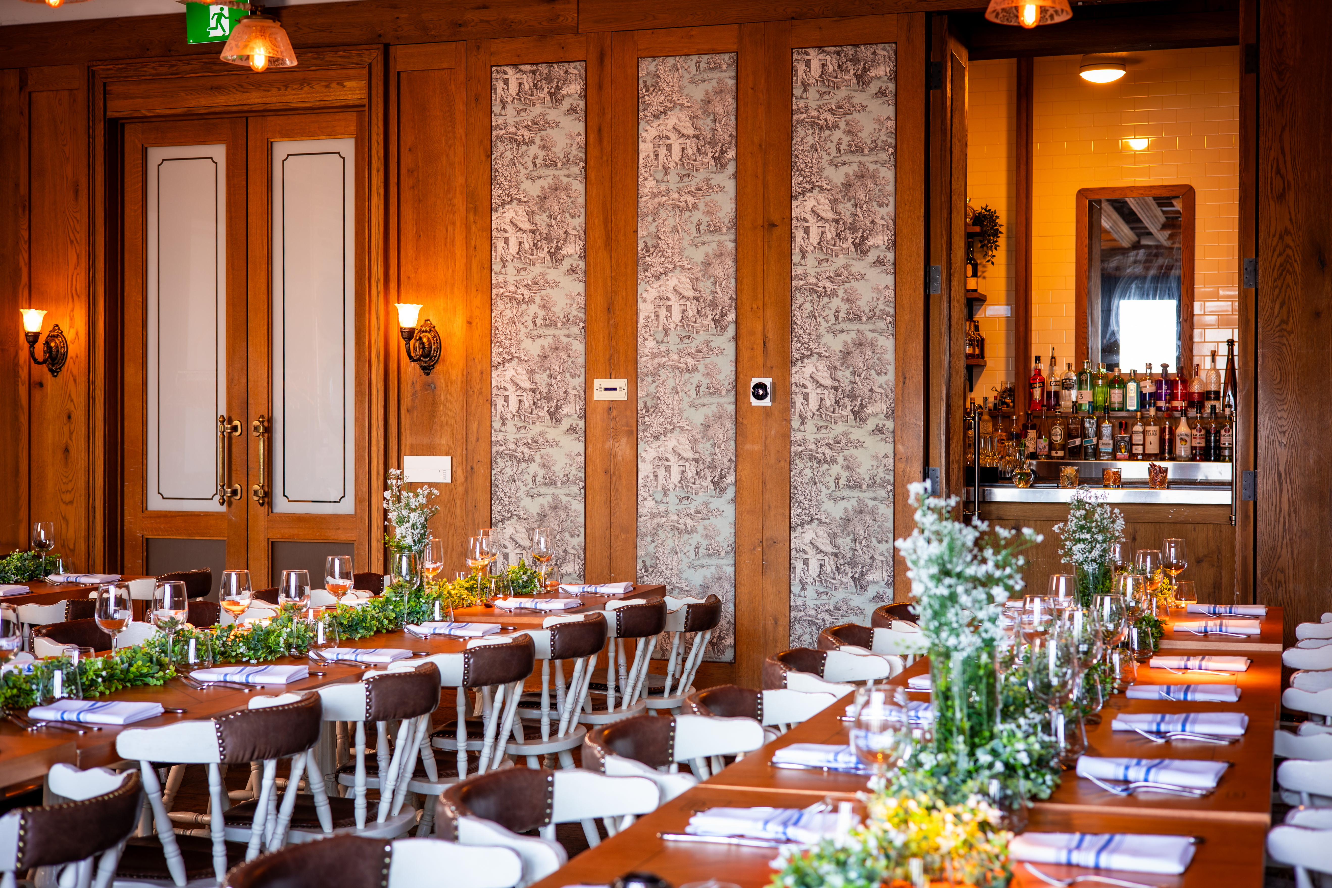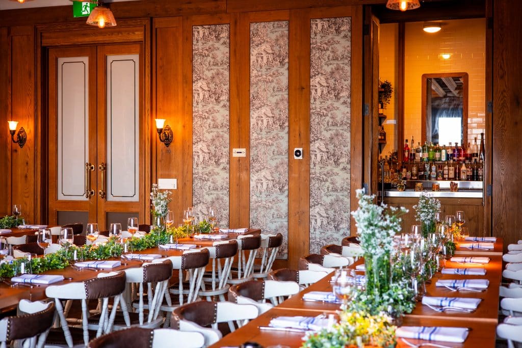 The Cluny Bistro Private Dining Room offers breathtaking aesthetics in a casual atmosphere. The venue features walls adorned with rich wood paneling and tufted fabric in a vintage toile-style print, hand-picked antique adornments, and exposed bricks make this private space perfect for intimate weddings, rehearsal dinners and social events, corporate, media or product launch events.